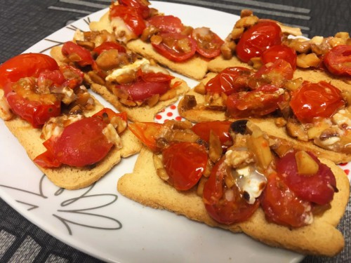 - Retirar del fuego y añadir el queso de cabra, mezclar y colocar sobre las tostadas